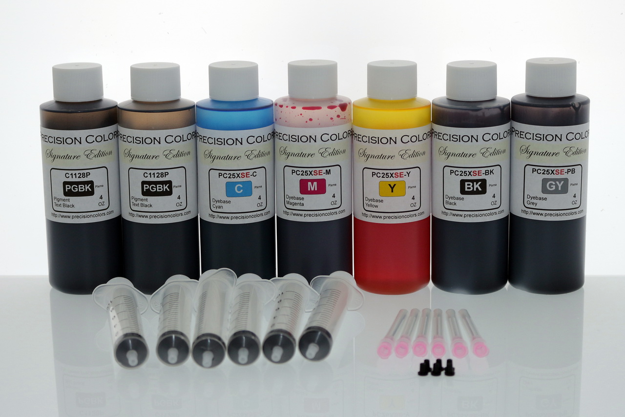 2x4oz Black Pigment Ink, 5 x 4oz Dye ink, Syringes and Needles for Refilling, 5 Micro Plugs.