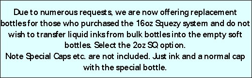 You can acquire bulk inks in any combination you desire. Mix and match the colors, bottle size and quantity required. Full flexibility in ordering is provided because everybody's needs are different. All prices are in USD.