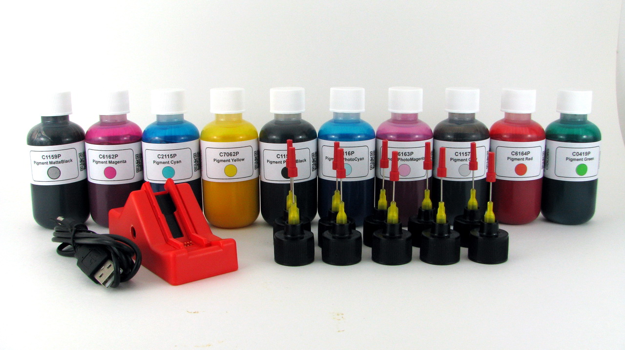 10 x 4oz Pigment ink with Squezy Bottle System, Dedicated PGI-9 Resetter. Simple, Convenient and Ideal starter refill system. Provides approx. 8 refills for each color.