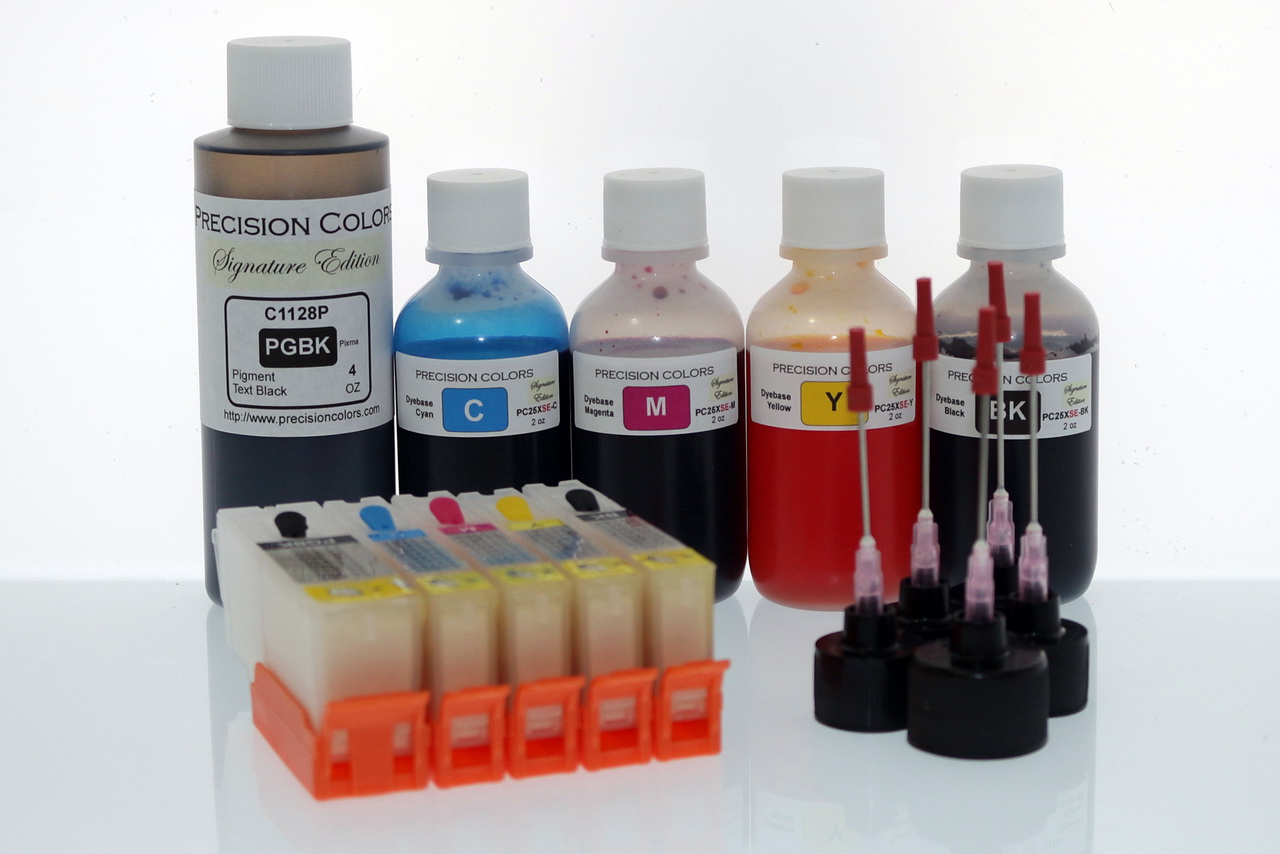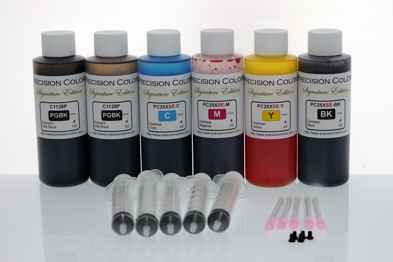 4/2x4oz Black Pigment Ink, 4 x 2/4oz Dye ink, 5 Syringes and Needles for Refilling, 5 250/251 compatible cartridges with ARC chips.