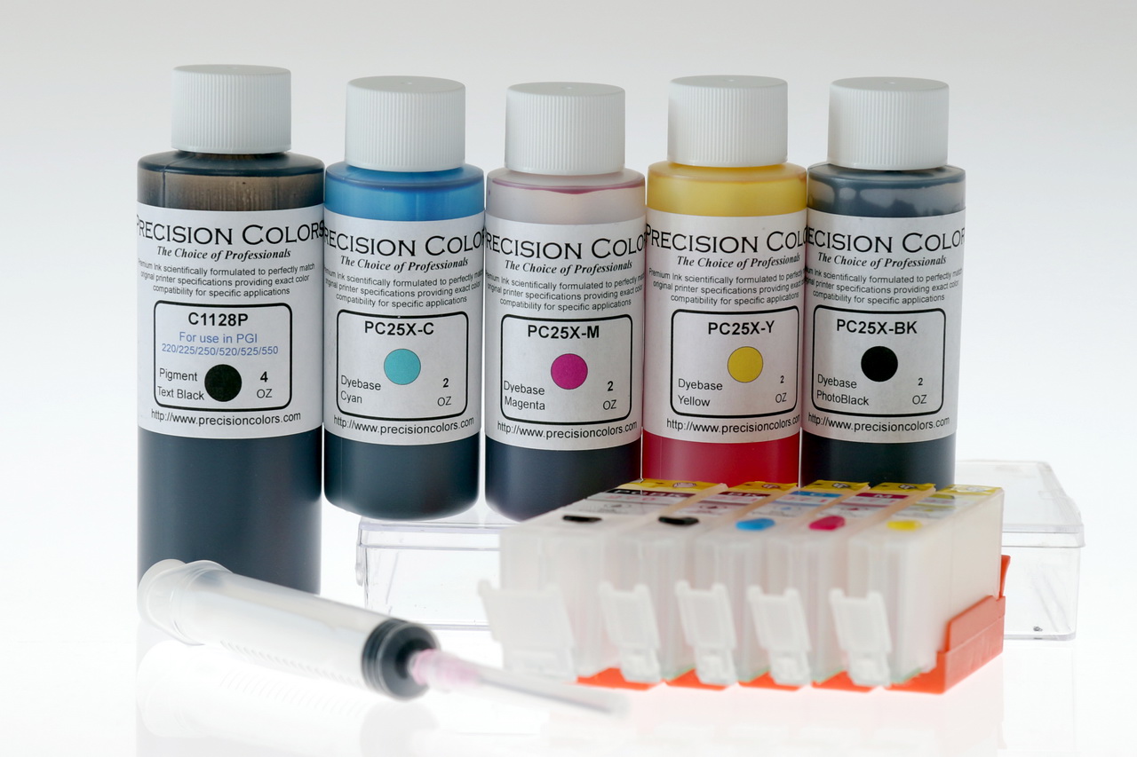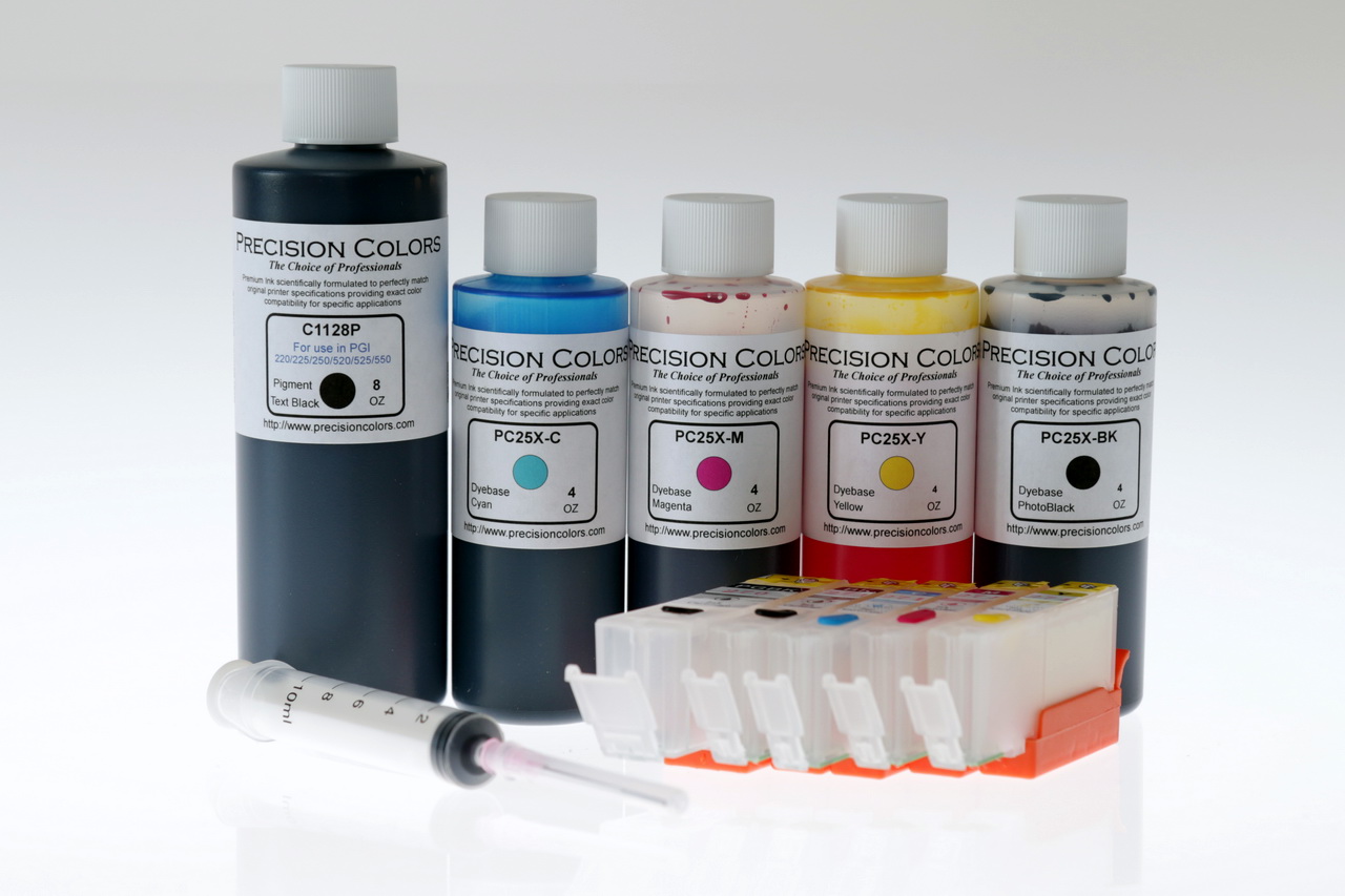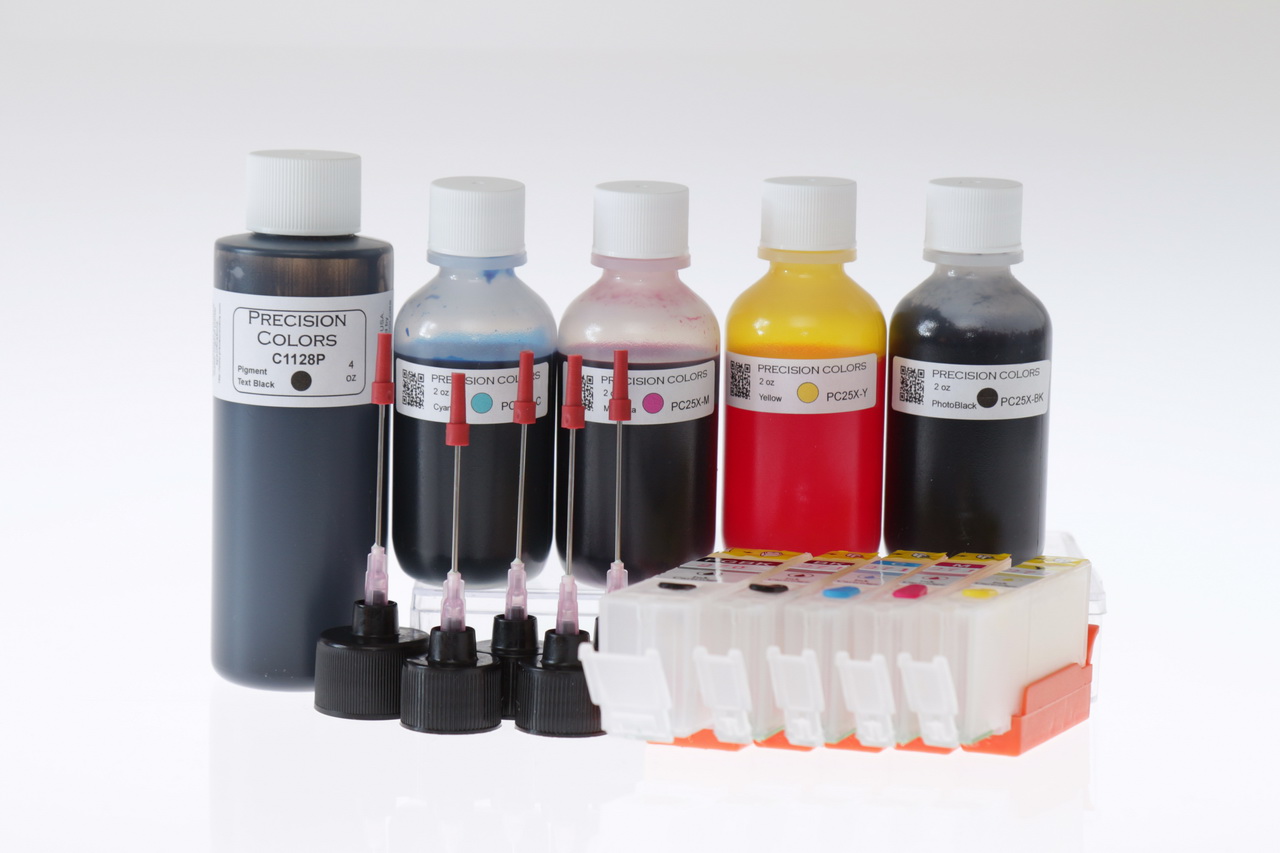 4/8oz Black Pigment Ink, 4 x 2/4oz Dye ink, Syringe and Needle for Refilling, 5 270/271 compatible cartridges with ARC chips. No resetter required.