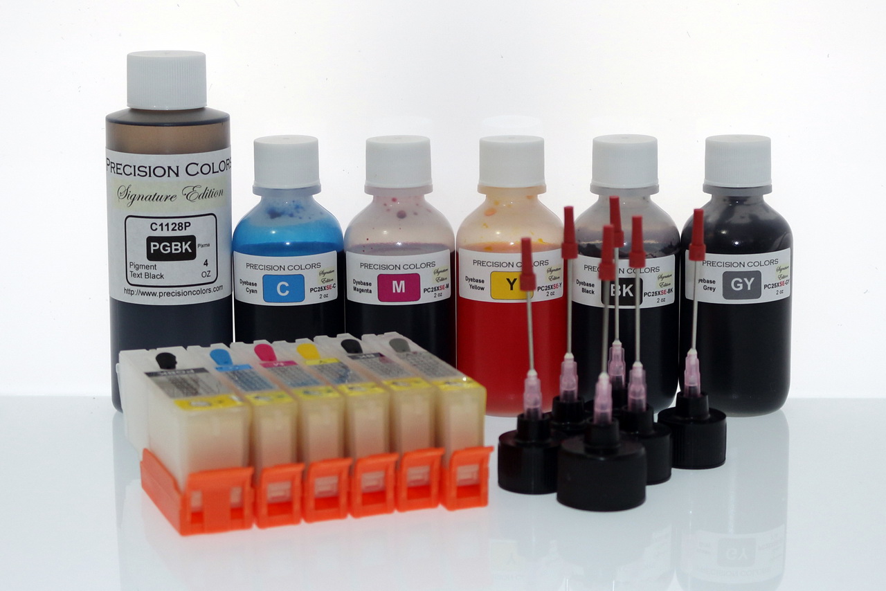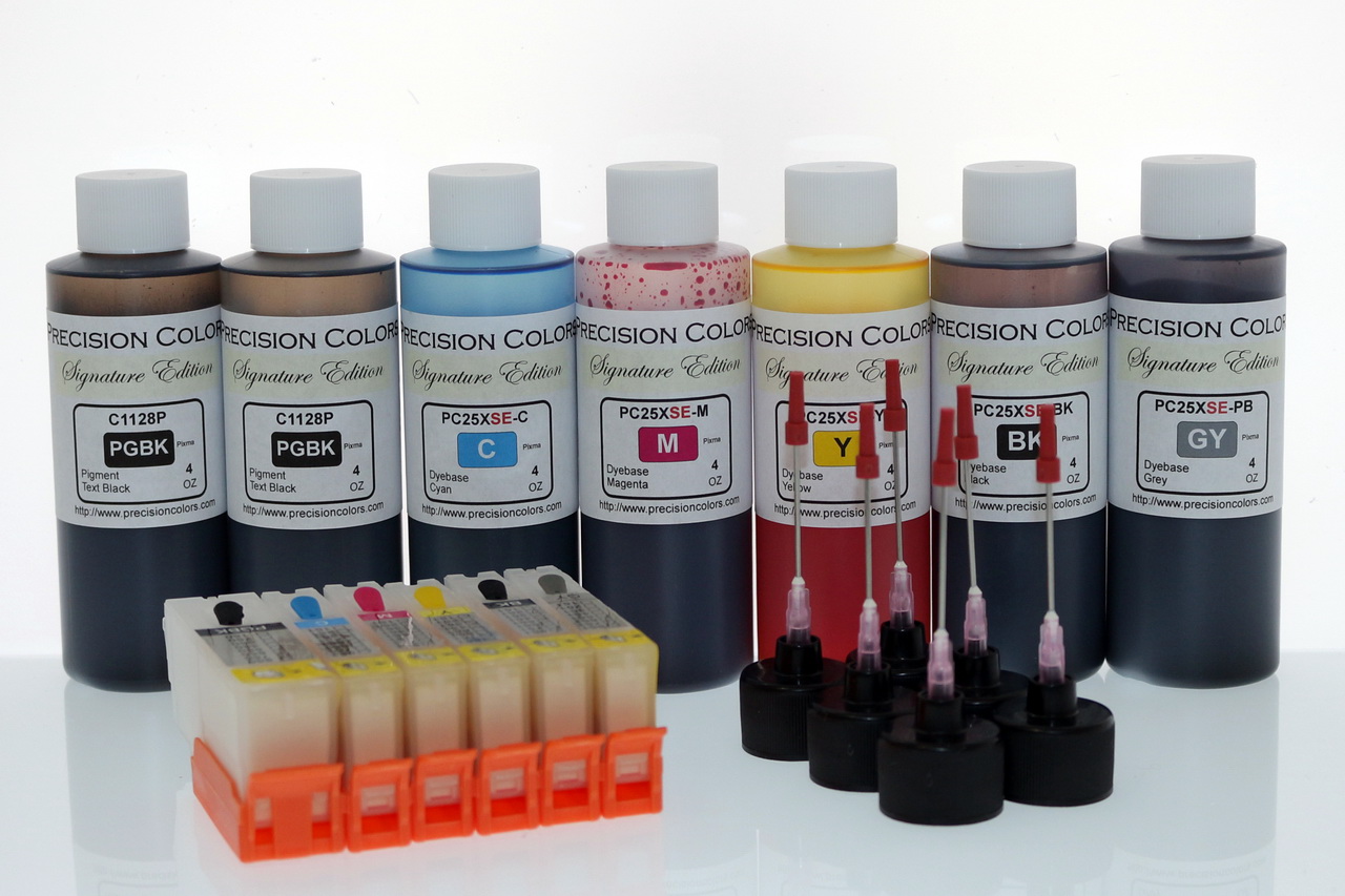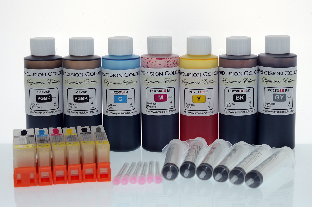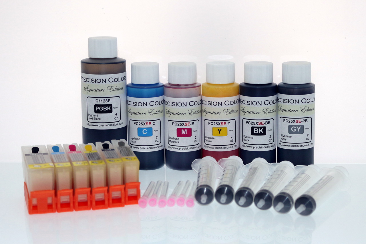 4/2x4oz Black Pigment Ink, 5 x 2/4oz Dye ink, 6 Syringes and Needles for Refilling, 6 250/251 compatible cartridges with ARC chips.