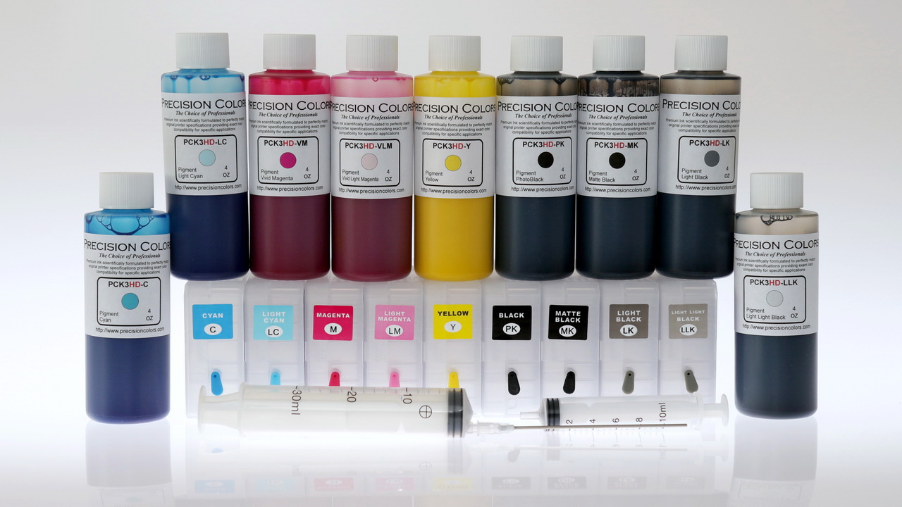 9 x 4oz Pigment ink, 9 empty refillable cartridges , 8 Squezy Cap System ( Not Shown), 1 Priming Syringe.