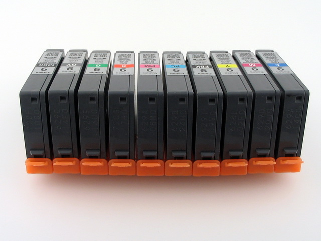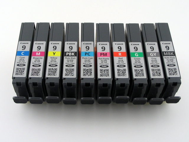 Set of 10 already Remanufactured PGI-9 cartridges with ink and all Canon OEM chips reset to full with shoes