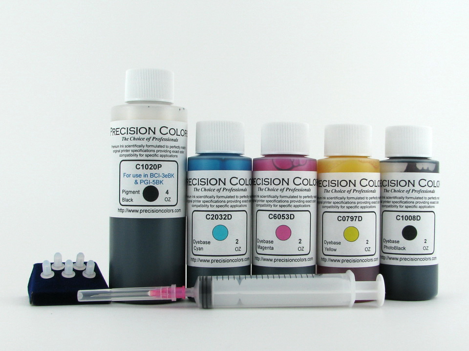 4oz Black Pigment Ink, 4 x 2oz Dye ink, Syringe and Needle for Refilling, 5 Clear Refill Plugs