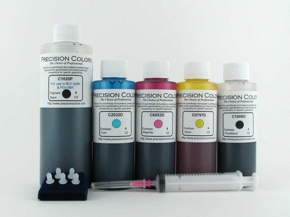 8oz Black Pigment Ink, 4 x 4oz Dye ink, Syringe and Needle for Refilling, 5 Clear Refill Plugs
