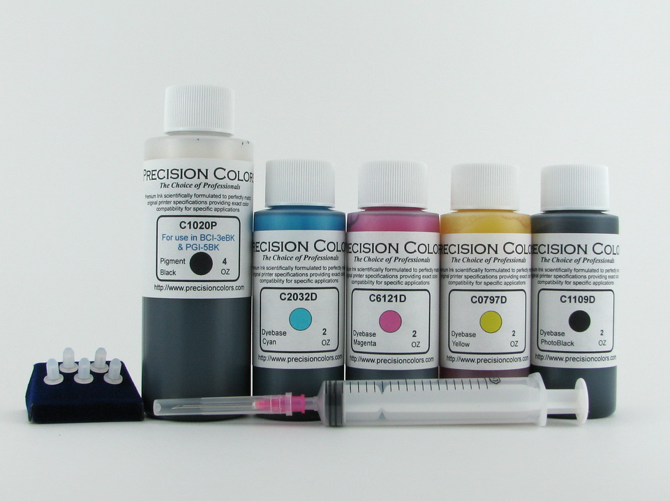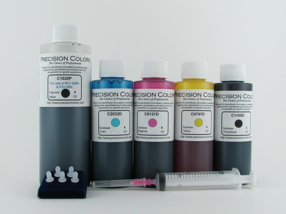 8oz Black Pigment Ink, 4 x 4oz Dye ink, Syringe and Needle for Refilling, 5 Clear Refill Plugs