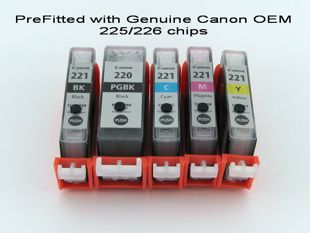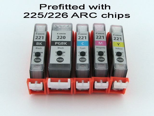 The 225/226 cartridges are totaly opaque and does not allow the refiller to see what the ink levels are and is not very refiller friendly. The Canon 220/221 series of cartridges have identical fit to the 225/226 cartridges but have a clear window to allow viewing of ink levels. You can transfer the 225/226 chips to the 220/221 bodies and gain the functionality of the clear window.