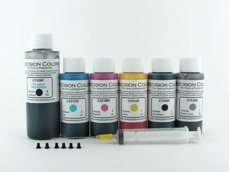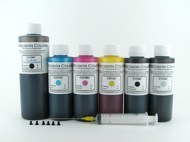 8oz Black Pigment Ink, 5 x 4oz Dye ink, Syringe and Needle for Refilling, 6 Low Clearance Refill Plugs